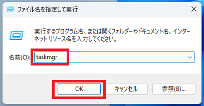 2. 「ファイル名を指定して実行」という小さな窓が開きます。「taskmgr」と入力します。